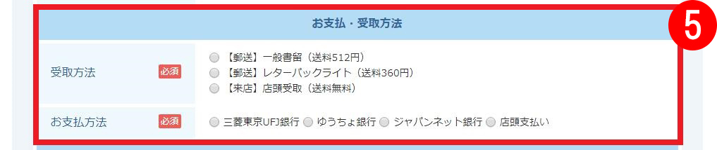 お名前(姓・名)、郵便番号、住所、マンション・建物名、電話番号、メールアドレス、受取方法、お支払い方法、ご質問等の各空欄に該当する内容をご記入ください。