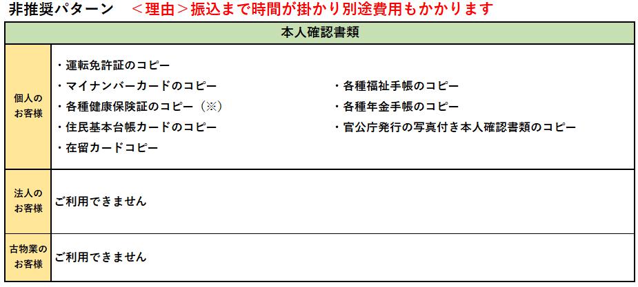 ゴールド会員昇格には下記の個人の方は『推奨パターン』か『非推奨パターン』、法人・古物業の方は『推奨パターン』の書類が必要となります。