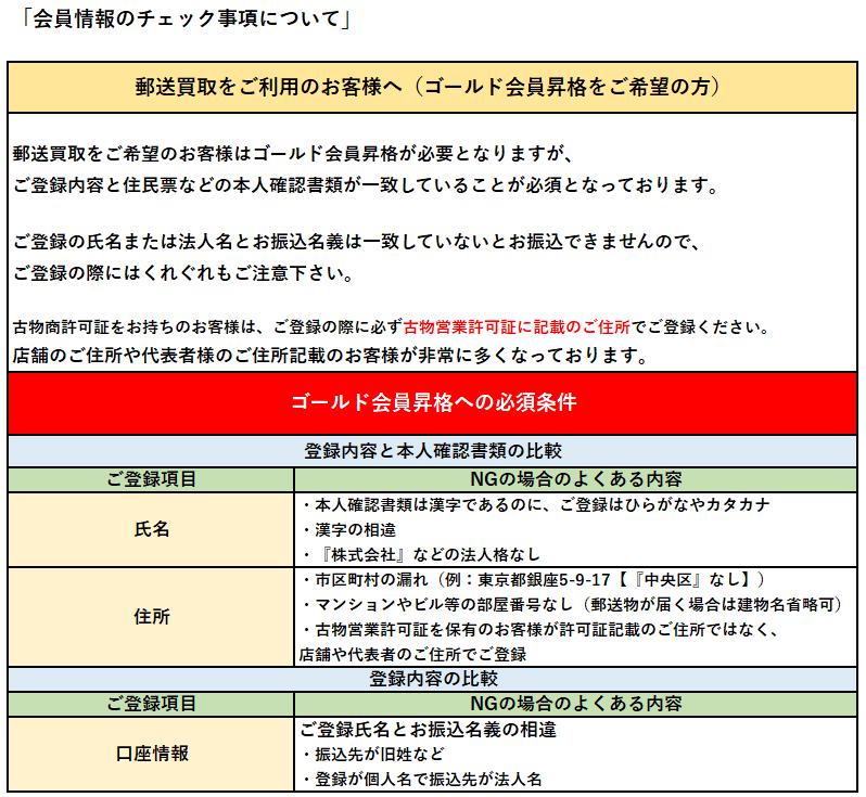 ゴールド会員昇格をご希望する場合は、初回のみ下記いずれかの書類を買取依頼品とご同梱下さい。