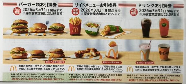 ● 金券ショップチケットレンジャーでは、日本マクドナルドホールディングス(マック)株主優待券(バーガー+ドリンク+ポテト引換券)2026年3月31日期限(買取は10冊まで)につきまして、買取価格が表示されている場合は買取を行なっております。