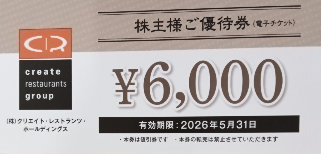 クリエイトレストランツ(磯丸水産・鳥良商店・雛鮨など)株主優待券 6,000円券 2026年5月31日期限(買取は未開封のみ)の購入(通信販売)