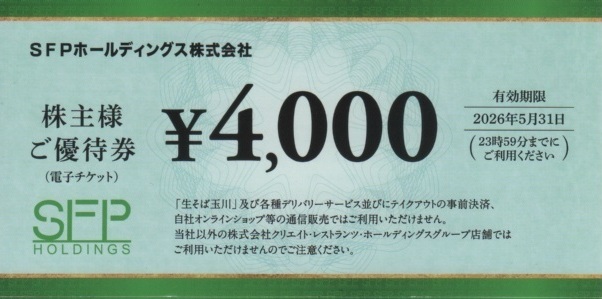 SFPホールディングス(磯丸水産・鳥良商店・きづなすし等) 株主優待券 4,000円券 2026年5月31日期限(買取は未開封のみ)の金券(格安チケット)のご購入に際しての注意事項