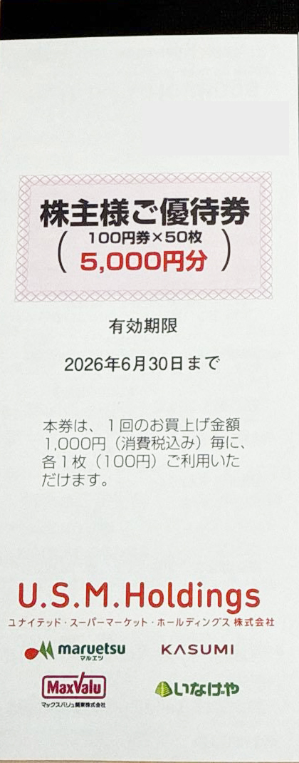 ユナイテッド・スーパーマーケット(USM)ホールディングス(マルエツ・カスミ・マックスバリュ関東)株主ご優待綴り(100円券×50枚)2026年6月30日期限_課税対象商品の買取