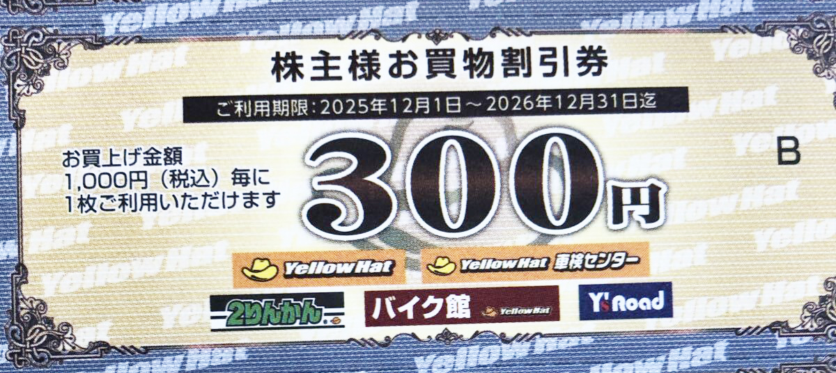 イエローハット株主優待券 300円券 2026年12月31日期限_課税対象商品の買取