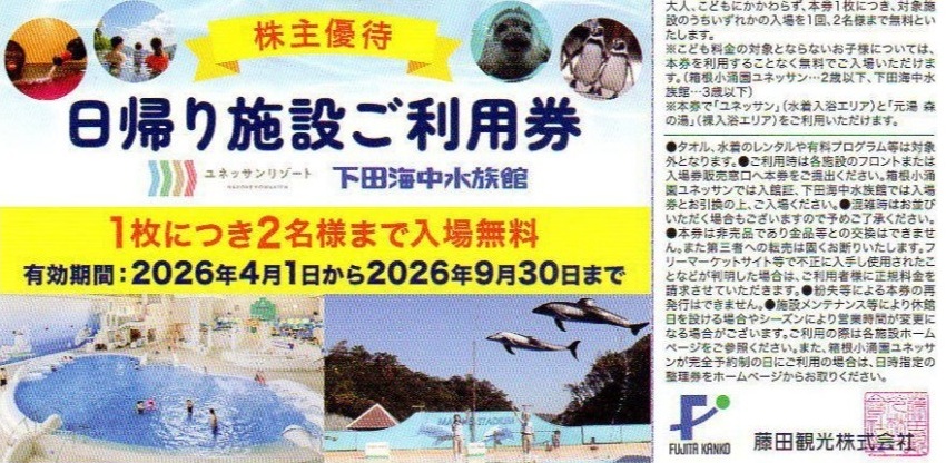藤田観光 株主優待券 日帰り施設ご利用券 1枚で2名まで入場可能(箱根小涌園ユネッサン・下田海中水族館)2026年9月30日期限の金券(格安チケット)のご購入に際しての注意事項