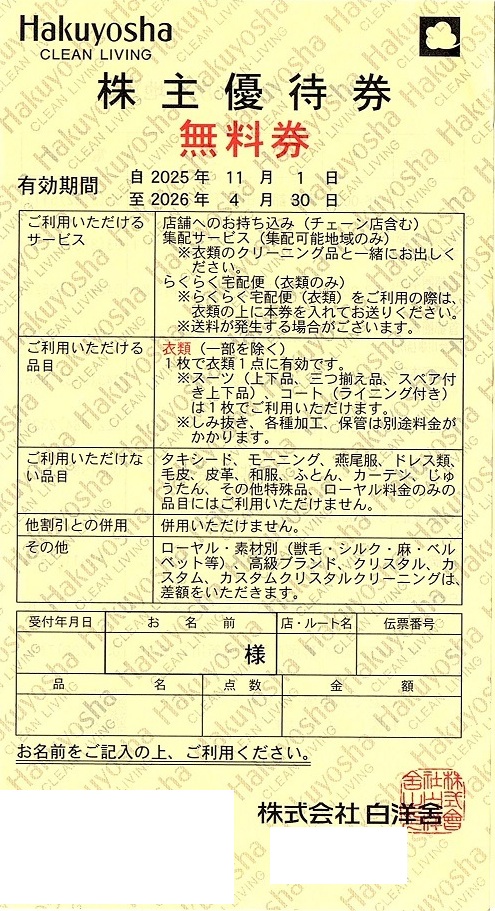 白洋舎株主優待券 無料券 2026年4月30日期限の買取
