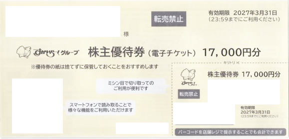 すかいらーく 株主優待券 電子チケット 17,000円券 2027年3月31日期限(買取はすかいらーくから届いた状態のまま 封筒未開封のみ)の買取